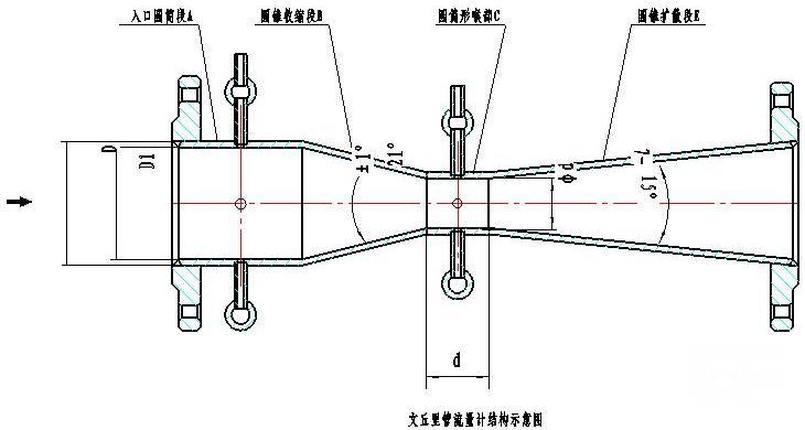 ●經(jīng)典文丘里管的軸向截面見上圖。它是由入口圓筒段A、圓錐收縮段B、圓筒形喉部C、圓錐擴散段E組成。圓筒段A的直徑為D,其長度等于D;收縮段B為圓錐形,并有21°±1°的夾角;喉部C為直徑d的圓筒形,其長度等于d;擴散段E為圓錐形,擴散角7°~15°。