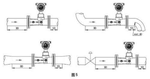 ⑦為了不影響流體正常輸送和便于維護(hù),要求安裝旁通管道,并**前≥3DN、后≥1DN的直管段(圖6)。